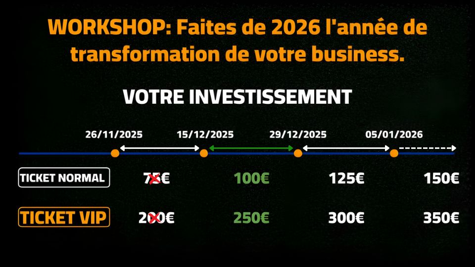 Rejoignez en live le workshop 2026 intensif, du 8 au 10 janvier, destiné aux entrepreneurs qui veulent une stratégie claire, des actions simples et un plan d’exécution prêt à être appliqué dès le lendemain.